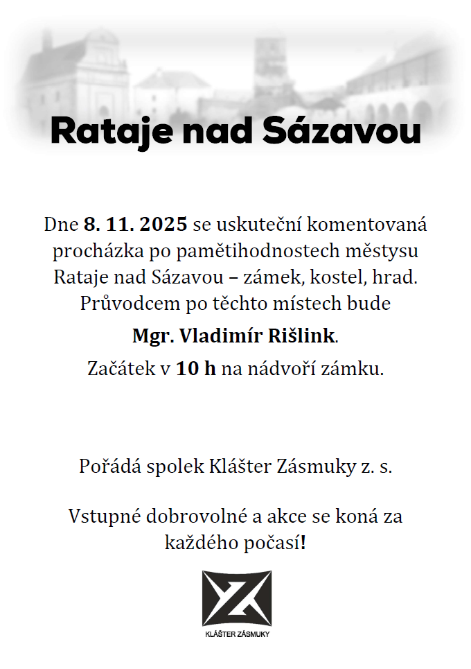 Konec léta byl mile ospalý. Dny byly teplé, prozářené slunečním svitem, a stín stromů v zámeckém parku příjemně chladil, když sedávala jsem pod nimi, pohlížejíc v otevřený severním směrem širý kraj. Jistě nepotřebuji vám všecku tu Krásu líčiti – vždyť máte ji před očima a kolem sebe každého Božího dne, důvěrně ji znáte, a sytíte jí své zraky a duše. Znáte, jak paprsky ranního slunce zlatí a růžoví průčelí kláštera, po něm kostelní věž, a když to vyšplhá oblohou výše i kostel sám, aby teprve potom zalilo svým jasem kraj k Poděbradům a Nymburku. I ta hvězda vidí spanilost Zásmuk, na které mezi prvými každého dne shlédne. To vše ale stane se nicotným, když přijde podzim, ten mistr palety nad mistry.